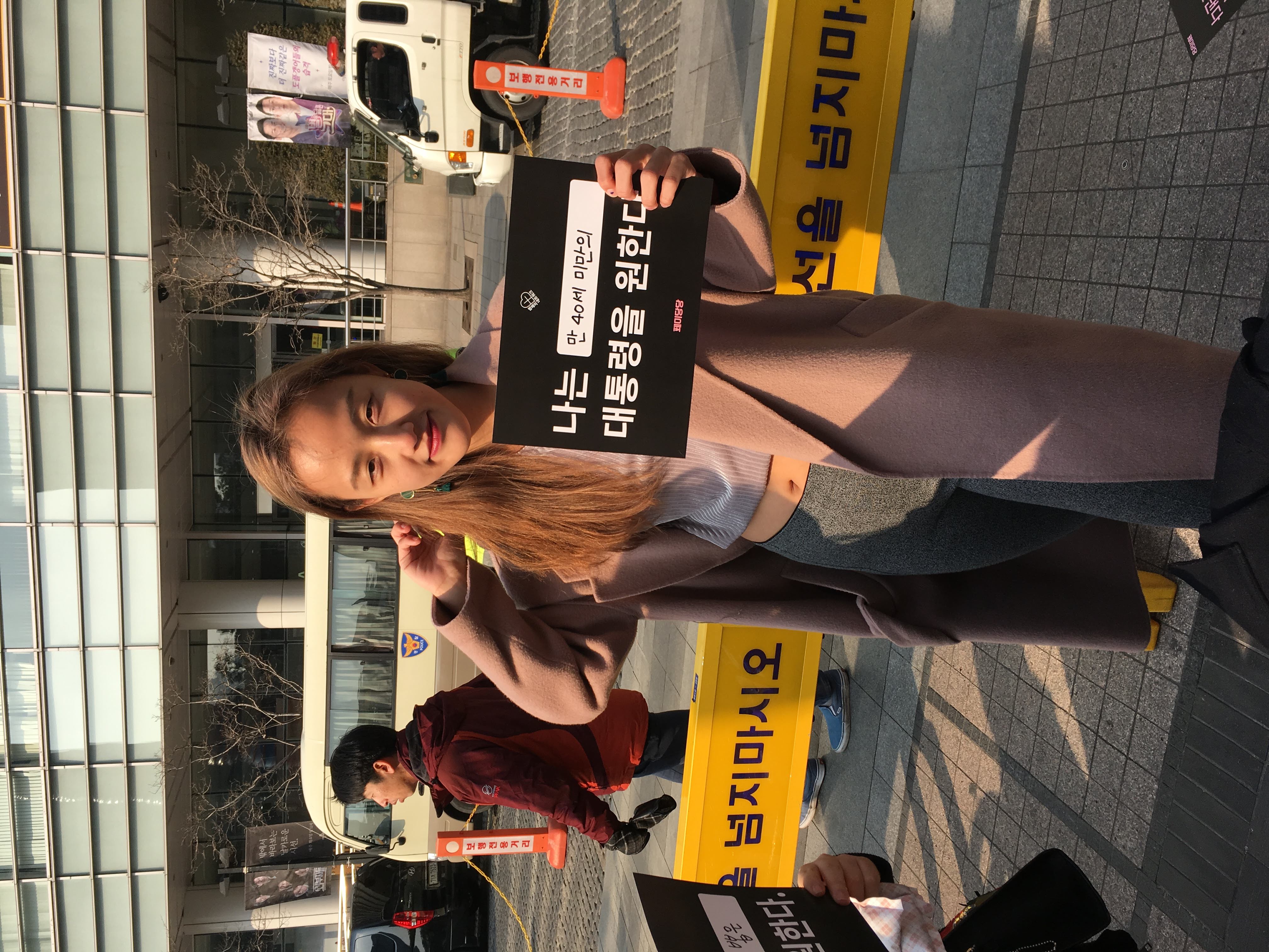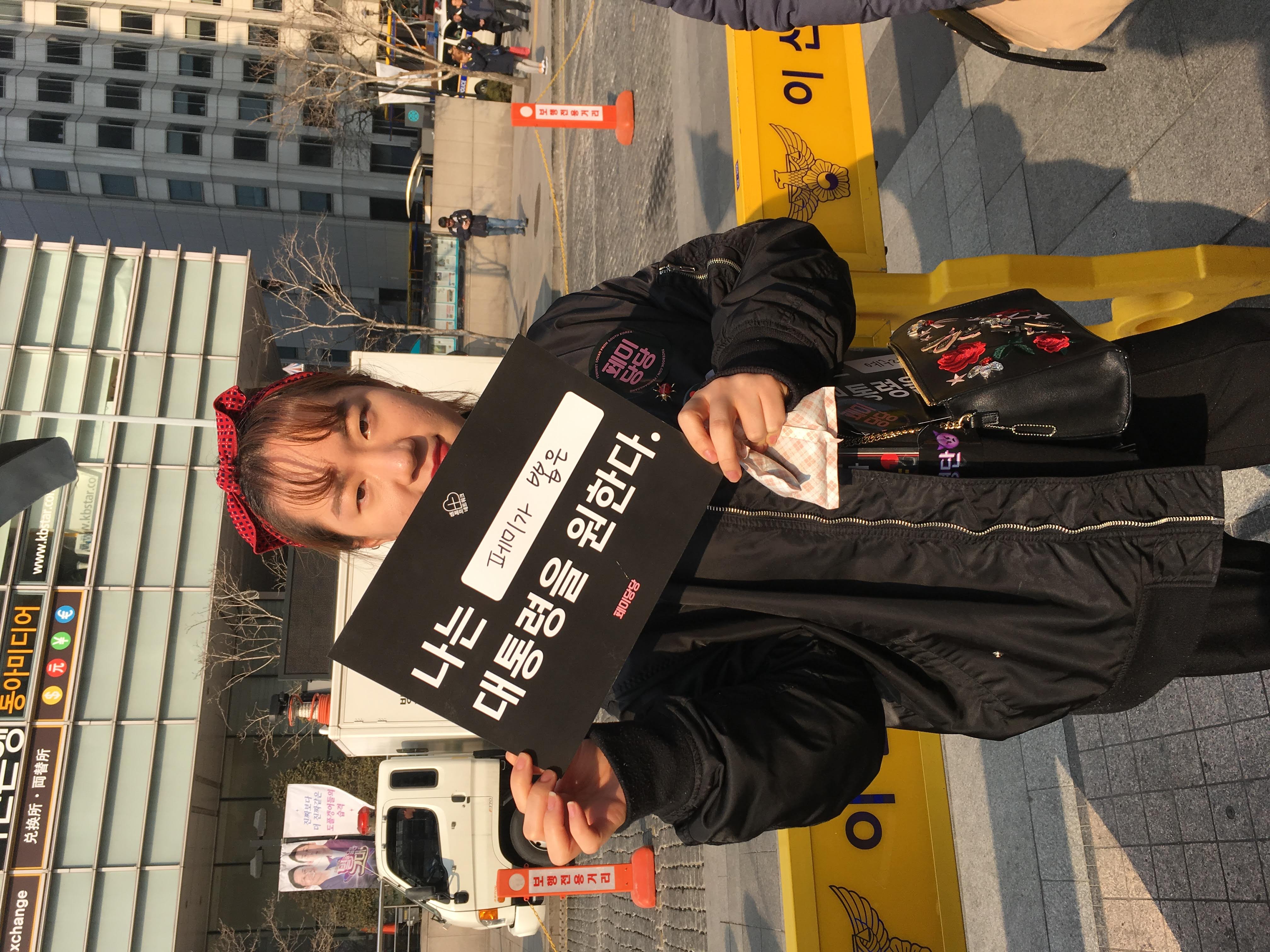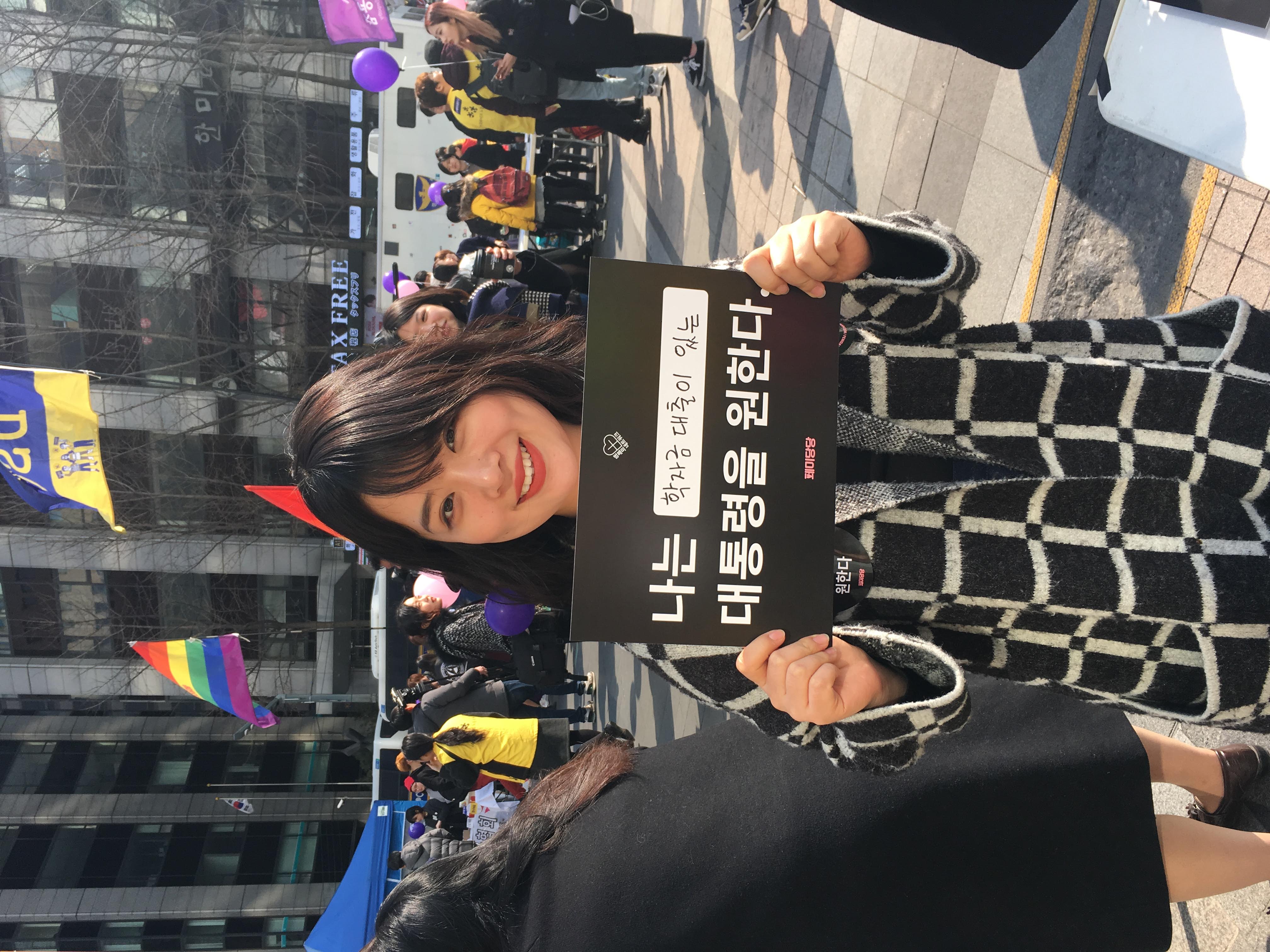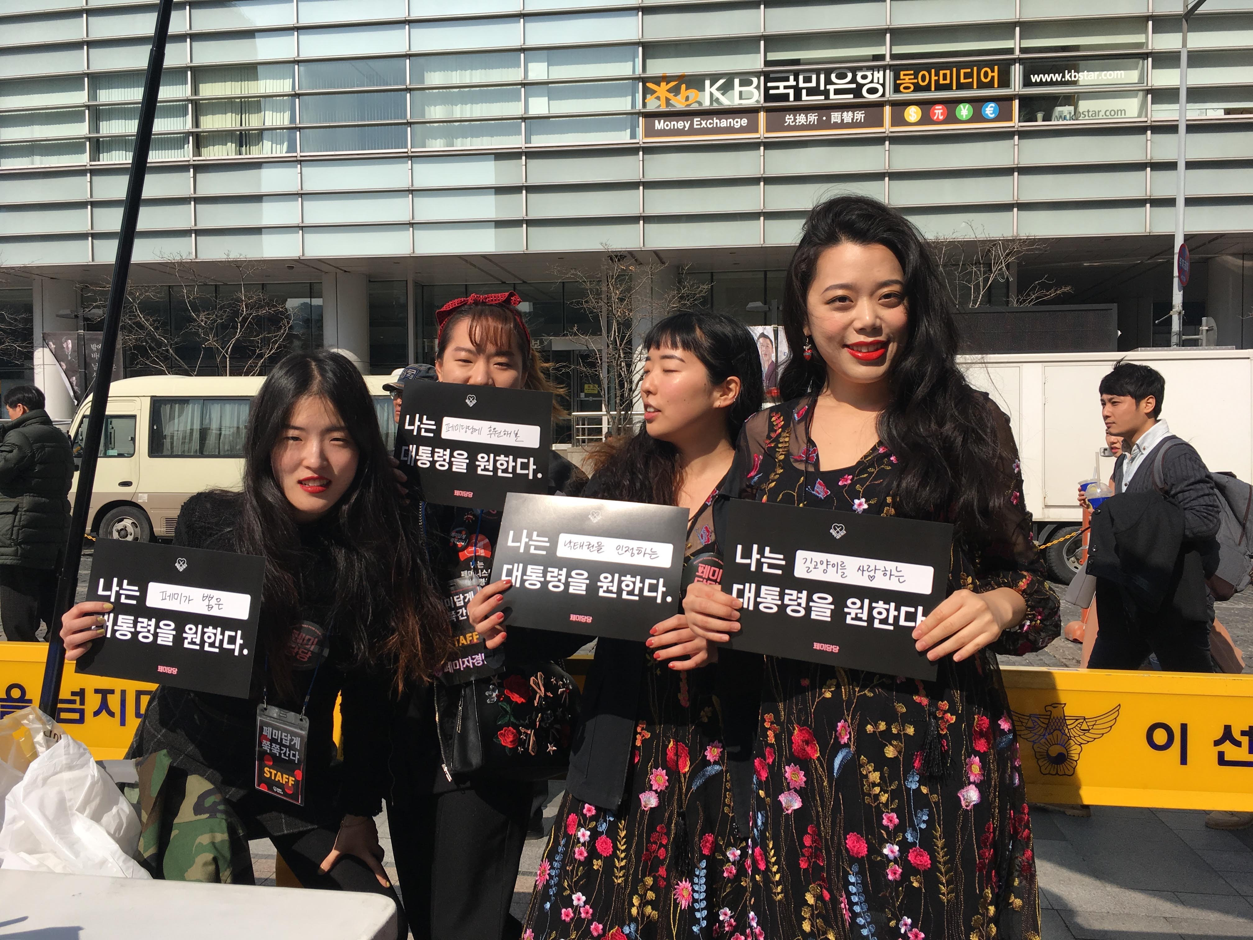 국제 여성의 날을 맞아 페미니스트 단체들이 청계광장에 모여 공동행동을 개최했다. 페미당당 부스에서는 “나는 ( ) 대통령을 원한다” 피켓을 시민들에게 배부하고, 괄호 안에 원하는 수식어를 직접 적게 하는 행사를 진행했다.
